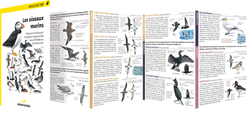 Vivre sur la mer immense, côtoyer les vagues et faire face aux tempêtes est un défi d’envergure que des oiseaux spécialisés ont su relever. Macareux, fous, labbes et autres puffins : les oiseaux marins appartiennent à plusieurs ordres différents. Ils montrent souvent une prédilection pour une frange de mer particulière et se répartissent donc de la côte jusqu’au large, en réduisant la compétition pour la nourriture. Pour les observer et faire leur connaissance, choisissez un point surélevé et balayez la mer aux jumelles ou à la longue-vue. Ce Miniguide vous permet d’identifier et découvrir 28 espèces emblématiques.