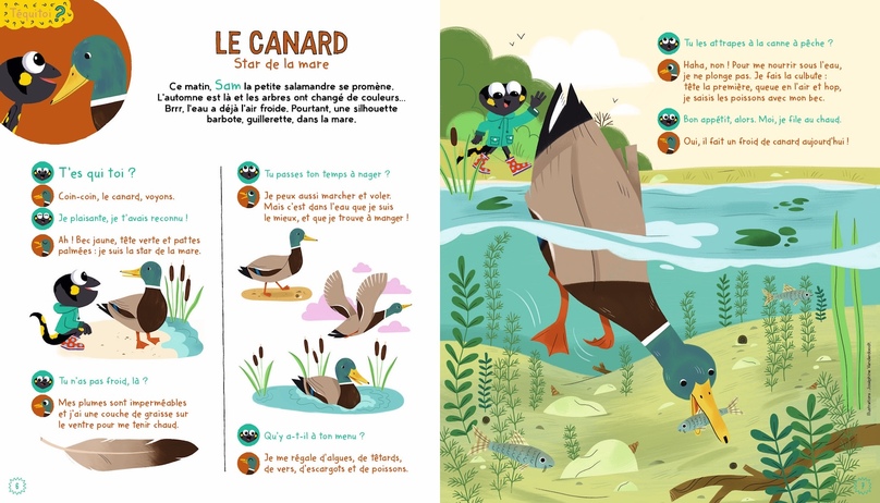 Sam la petite salamandre se promène. L’automne est là et les arbres ont changé de couleurs. Brrr, l’eau est froide. Pourtant, une silhouette barbote, guillerette, dans la mare.