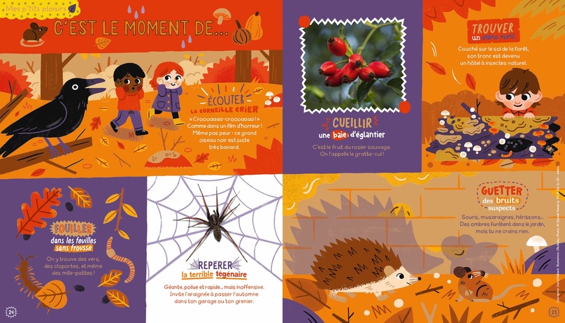 - Les petits plaisirs : En octobre et novembre, c’est le moment d’écouter la corneille crier, de fouiller dans les feuilles, de repérer la terrible tégénaire, de cueillir une baie d’églantier, de trouver un arbre mort, et de guetter des bruits suspects...